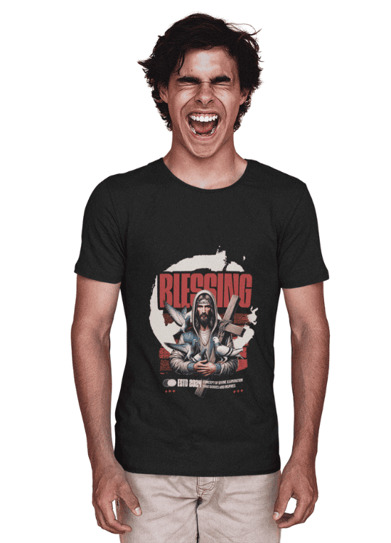 Diseño con impresión frontal que destaca el mensaje "Bendecido"