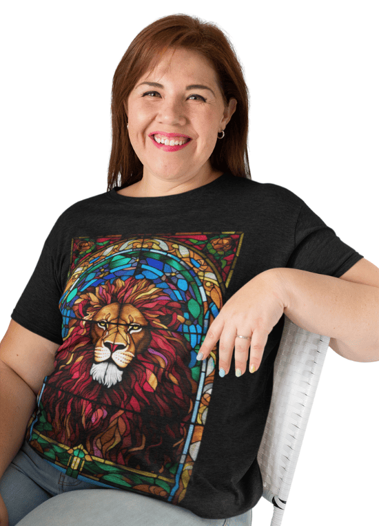 Diseño artístico que une la fuerza del León de Judá con la belleza simbólica de los vitrales.